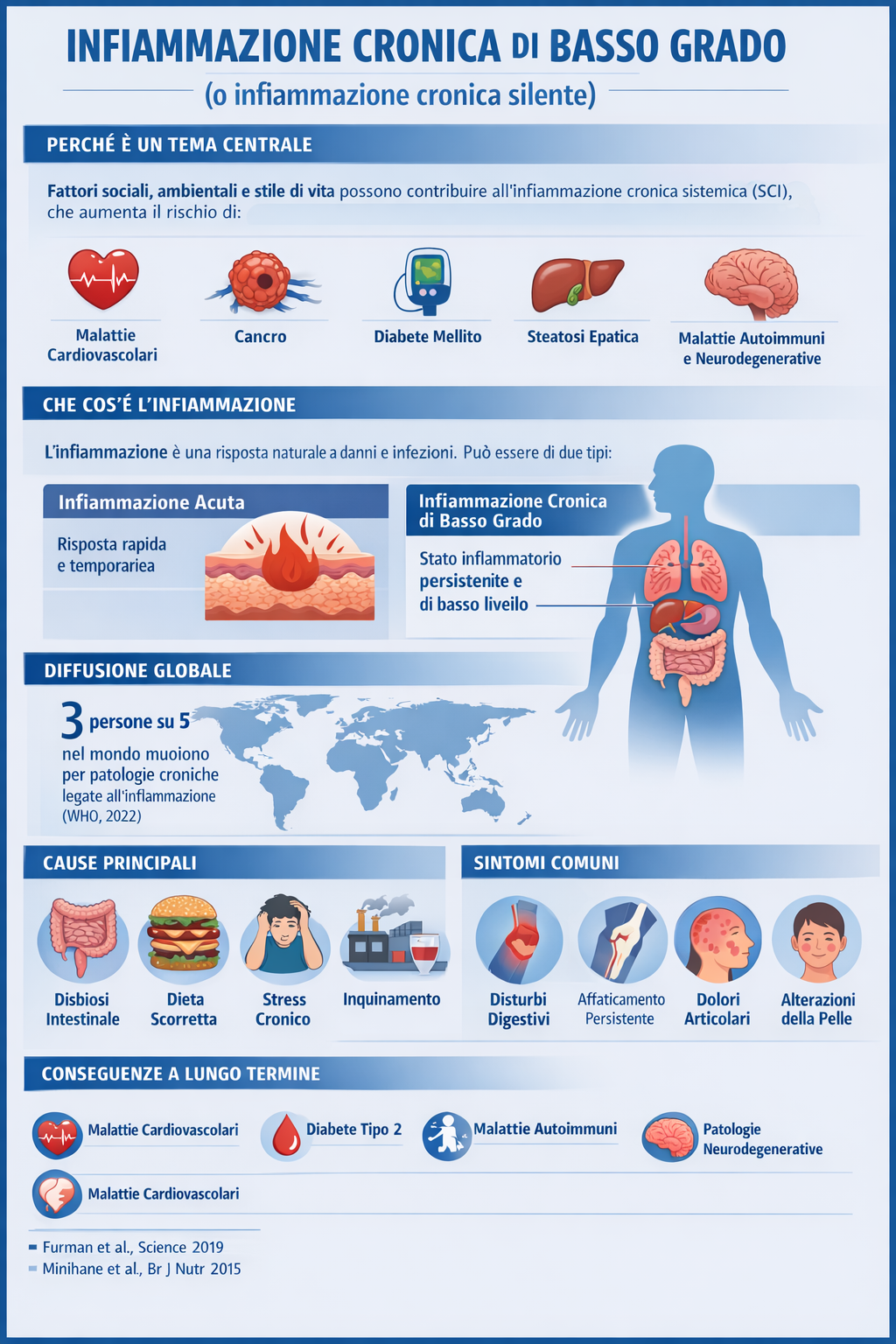 Sebbene l’aumento intermittente dell’infiammazione sia fondamentale per la sopravvivenza durante lesioni fisiche e infezioni, recenti ricerche hanno rivelato che alcuni fattori sociali, ambientali e legati allo stile di vita possono favorire l’infiammazione cronica sistemica (SCI) che, a sua volta, può portare a diverse patologie che, nel loro insieme, rappresentano le principali cause di disabilità e mortalità in tutto il mondo, come malattie cardiovascolari, cancro, diabete mellito, malattia renale cronica, steatosi epatica non alcolica e malattie autoimmuni e neurodegenerative.