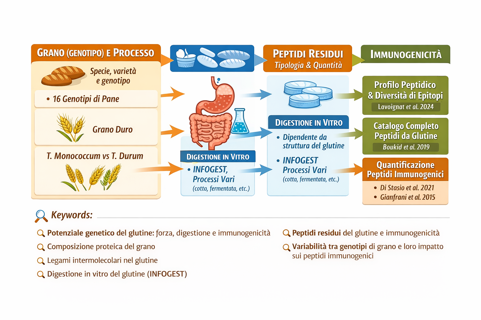 Analisi peptidomiche su pani sottoposti a digestione in vitro mostrano una notevole diversità di peptidi, correlata al genotipo del grano, alle condizioni agronomiche e alle tecnologie di trasformazione (Lavoignat et al., 2024). Ciò conferma che il profilo peptidico finale non è determinato esclusivamente dalla sequenza proteica, ma anche dall’architettura del network e dalla sua storia di processo.