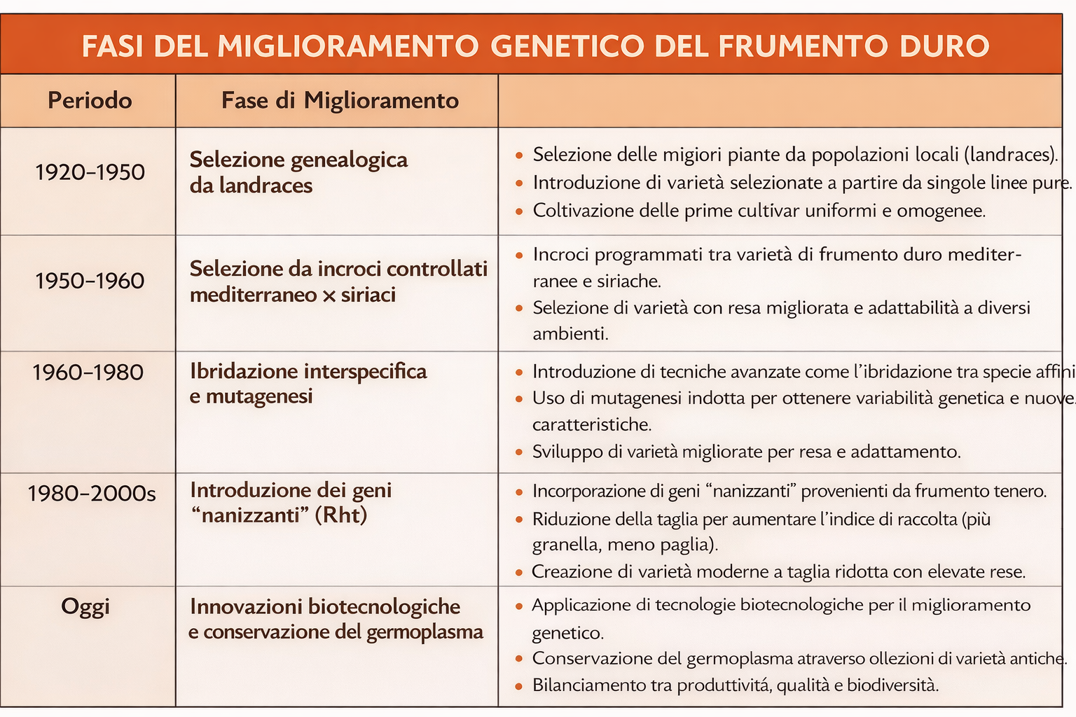 Il documento descrive le principali fasi del miglioramento genetico del frumento duro in Italia: dalla selezione genealogica a partire dalle landraces (1920-1950), allo sviluppo di varietà derivate da incroci controllati tra genotipi mediterranei e siriaci (anni ’50-’60), fino all’introduzione di tecniche più avanzate come l’ibridazione interspecifica, la mutagenesi e l’uso dei geni nanizzanti (Rht) per la riduzione della taglia e l’aumento dell’indice di raccolta.