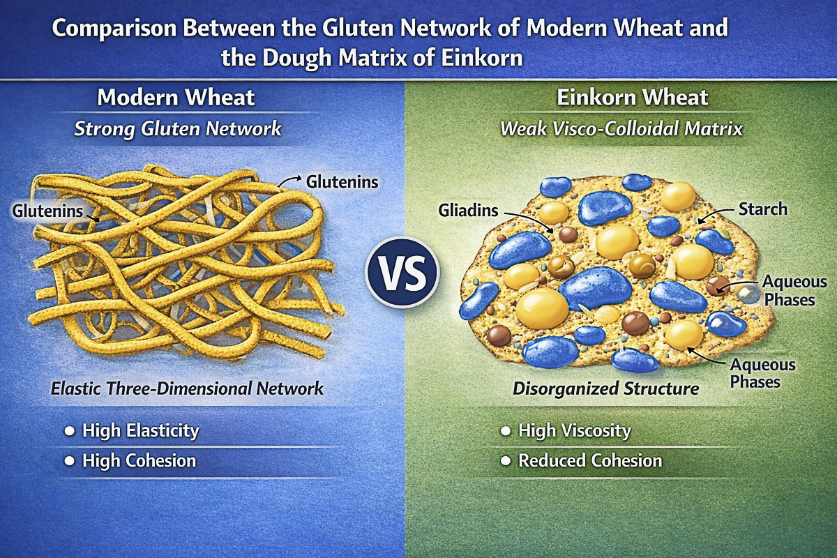 As previously described, the gluten network of einkorn is generally weaker than that of modern wheats and does not form an equally developed continuous elastic structure. Dough behavior is dominated more by viscosity and colloidal cohesion phenomena rather than by a well-organized elastic gluten network.