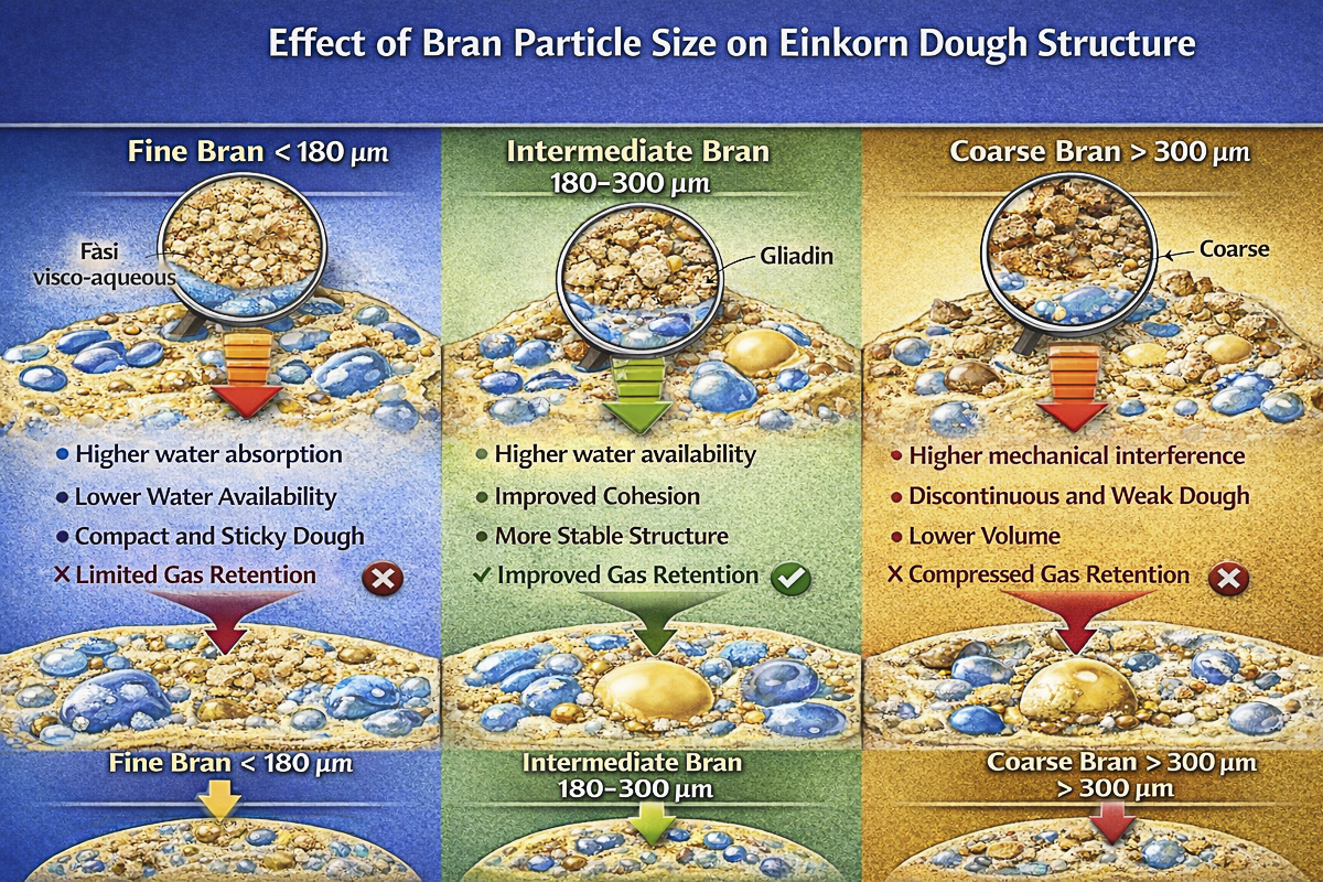3️⃣ In einkorn, an intermediate bran particle size may have a structuring effect on the dough, acting as a colloidal filler within the matrix and contributing to the stabilization of gas bubbles during fermentation.